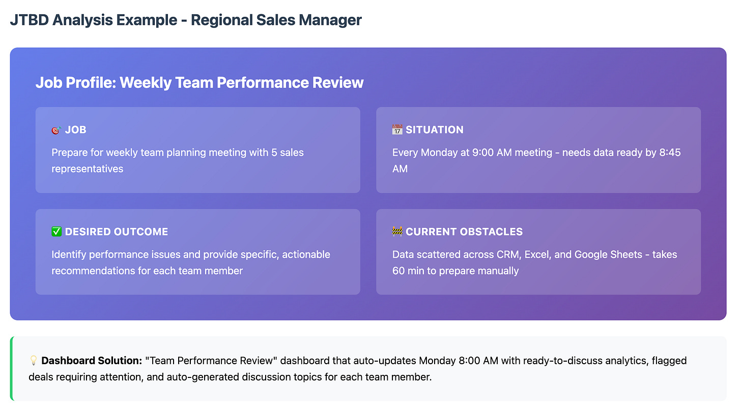 Look for patterns in their responses. A regional sales manager might have jobs like “Identify underperforming team members before the weekly meeting” or “Spot emerging sales trends to adjust strategy.”