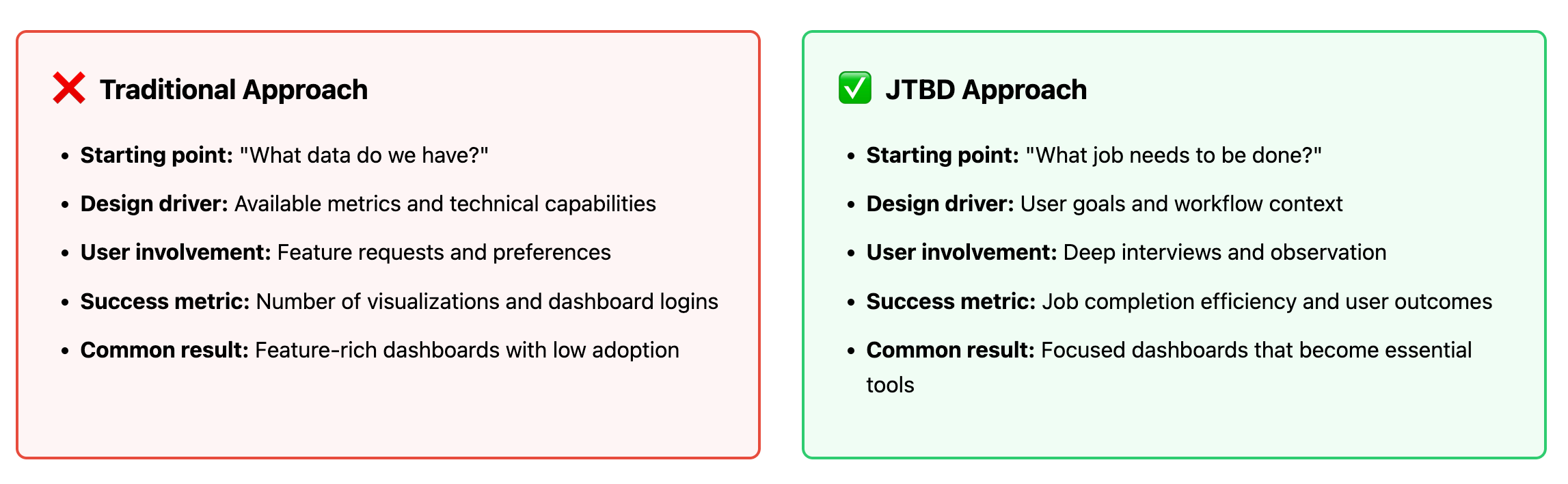 For dashboard developers, adopting JTBD means committing to deep user research, resisting the temptation to build features without clear job-based justification, and measuring success by how well users can complete their work — not by how impressive your visualizations look.