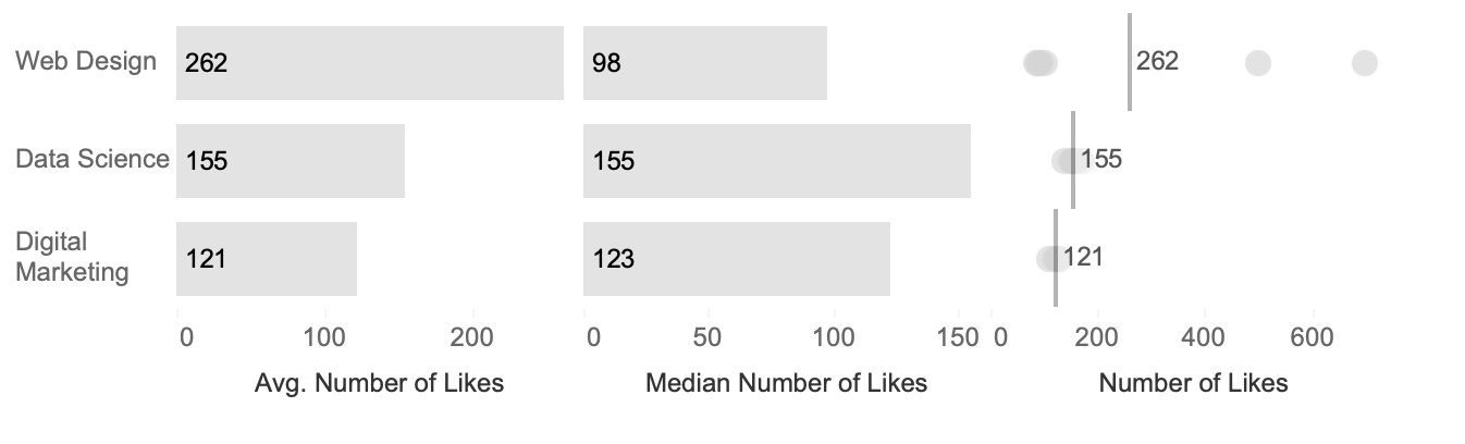 I had a very interesting case long time ago where just relying on statistics wasnāt enough, and visualizing the data with a single chart wasnāt sufficient either. We were trying to analyze the results of different blog posts, and one of the metrics was the number of likes. While this use case is fabricated, itās quite close to reality. As you can see, the average number of likes is higher for Web Design, and the median is higher for Data Science. However, there are two outlier posts in Web Design, which means most posts werenāt performing well, but these two were exceptionally popular. They turned out to be review posts that were indeed very popular. The takeaway is that if we had only relied on averages or medians, we would never have discovered these outliers.