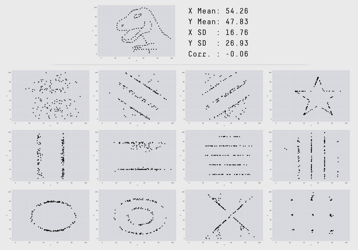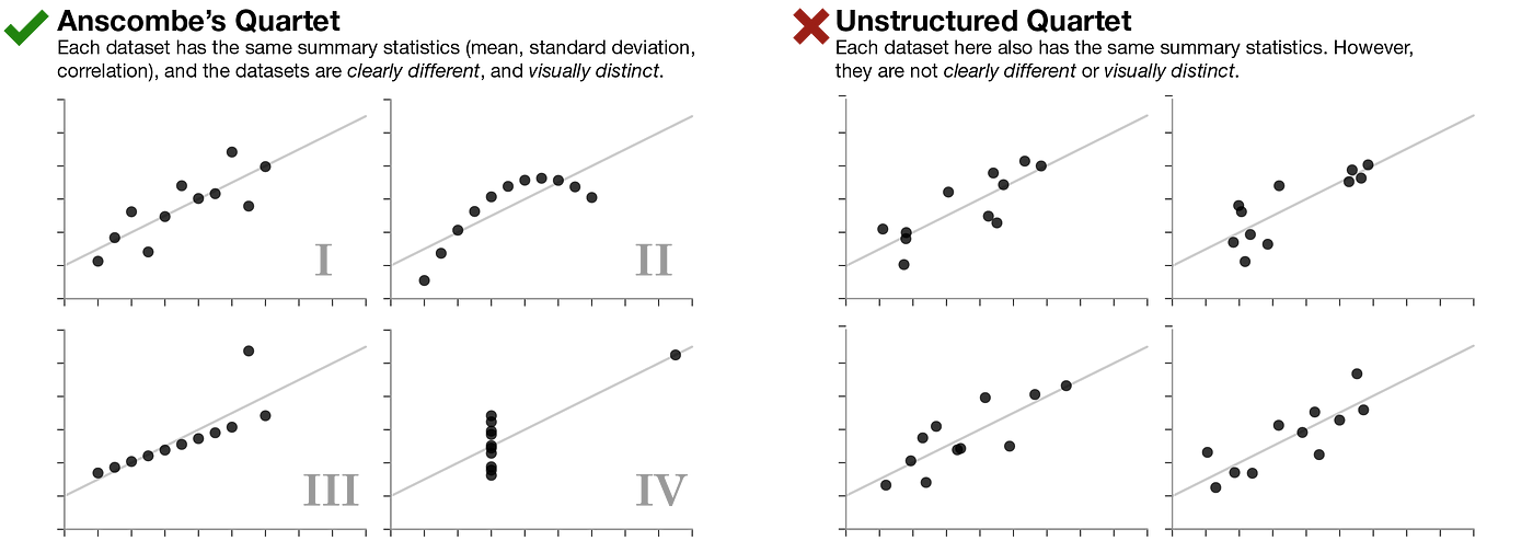 Both datasets were developed to remind analysts that statistical analysis without visualization can miss critical nuances, patterns, or outliers. Visuals offer the opportunity to catch errors and unlock insights that numbers alone may obscure.